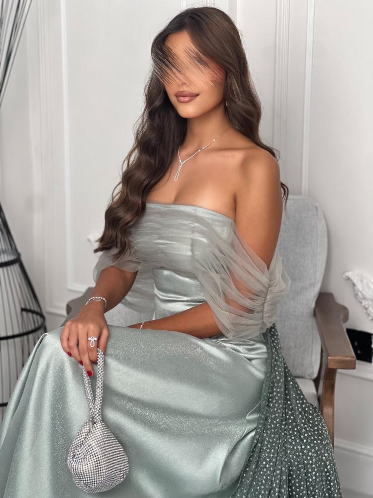 يتميز التصميم بقصة أوف شولدر مع طبقة شفافة تضيف لمسة أنثوية ناعمة، بينما يمتد الذيل بخامة منقطة تضفي تفاصيل إضافية جذابة. القماش الخفيف يجعل الفستان مريحًا للارتداء ومثاليًا للمناسبات المختلفة.